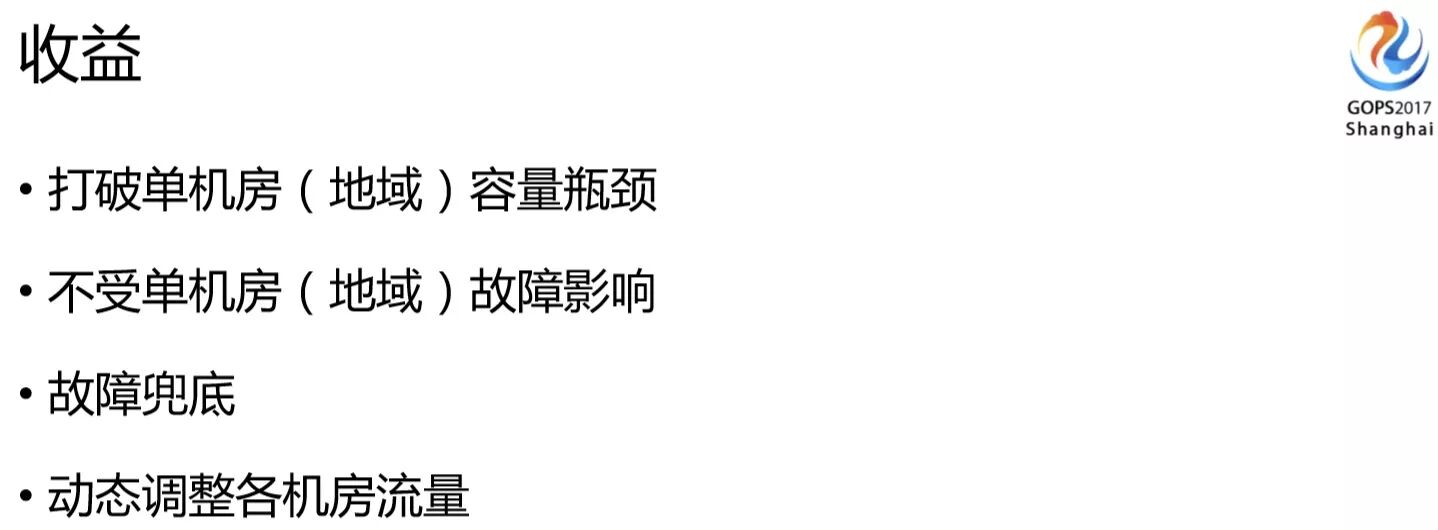 我们多活做了之后,首先打破了单机房容量的瓶颈,单机房不能扩容的时候,我们现在可以在另外的机房扩容我的机器,也可以分不同的流量来满足负载,就不再受到单个机房容量的限制。