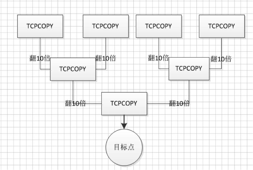 主要通过 TCPCopy 复制端口流量,多层翻倍放大流量。如下图就直接将每层流量翻倍整体就是 1,000 倍,工具实现简单,可以实现多条线组合进行流量复制。通过这种方式发起超负荷的请求,检验服务能够承载的容量。