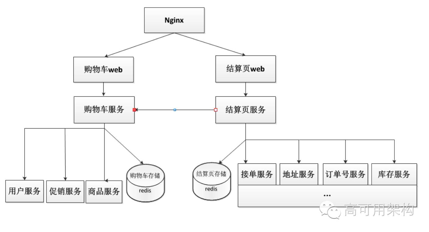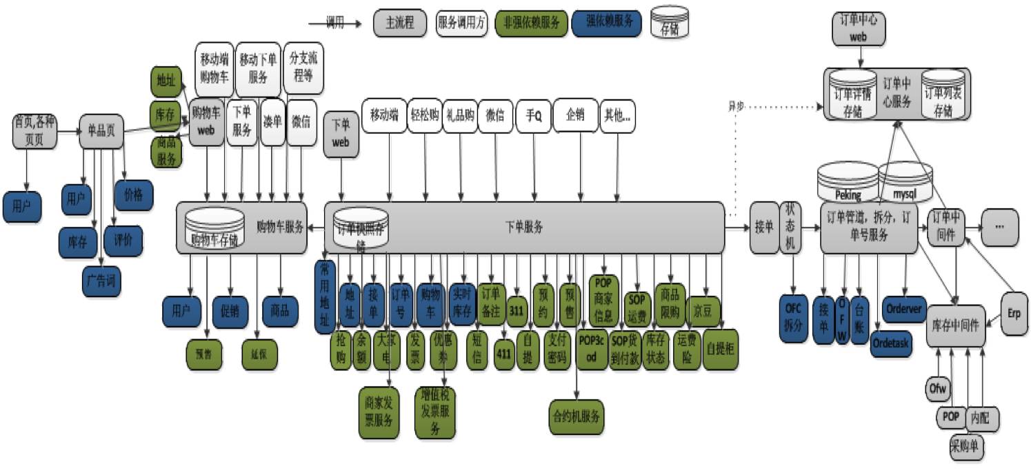 从购物车开始,我们从上到下是一个典型的分层结构,上面是调用来源,中间是我们的服务,下面是依赖的底层服务。其中强依赖服务是关键路径所需要调用的服务,是主流程中不可缺少的一部分。