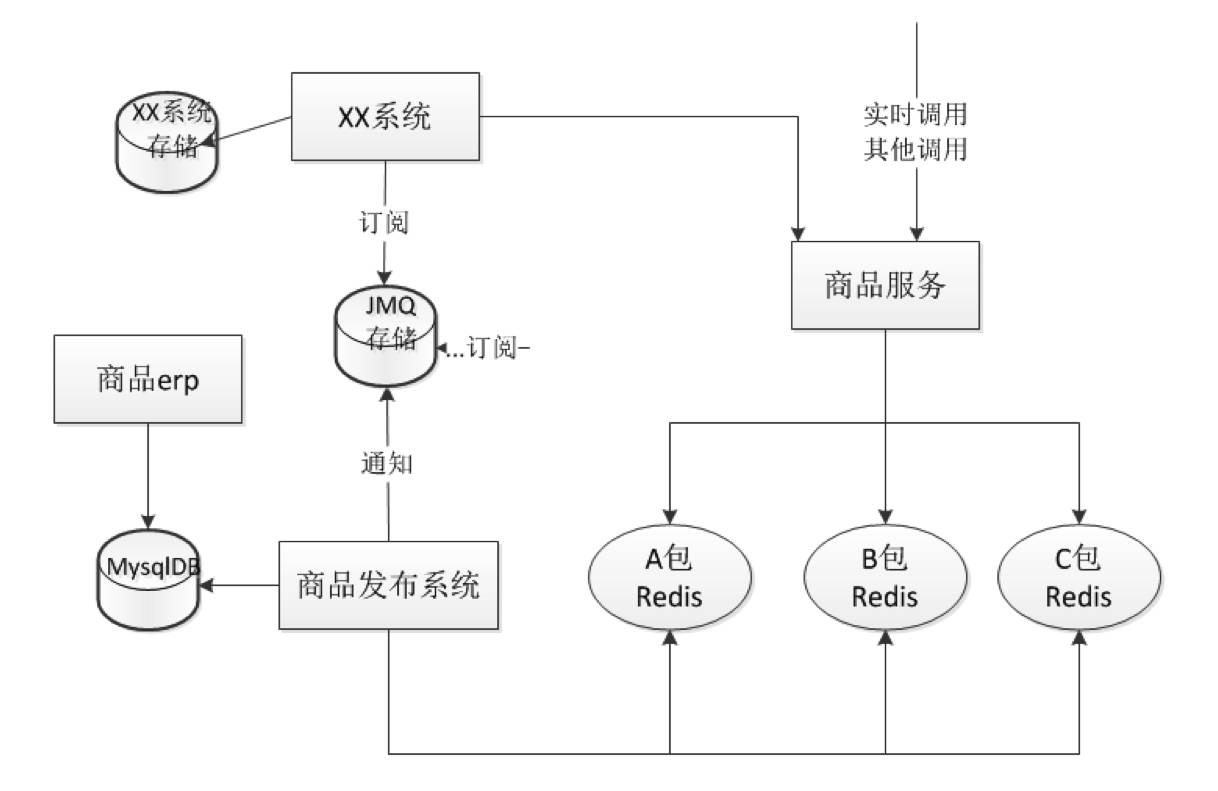 后面看一下看不到商品服务的一切异构。ERP 过来,是采销或者 POP 用户,进入我们的 MySQL,通过商品发布系统,接到商品消息在这一块之前是不能售卖,这一块直接发出去,这个消息会写自身的存储,我们会装 A 包、B 包、C包。