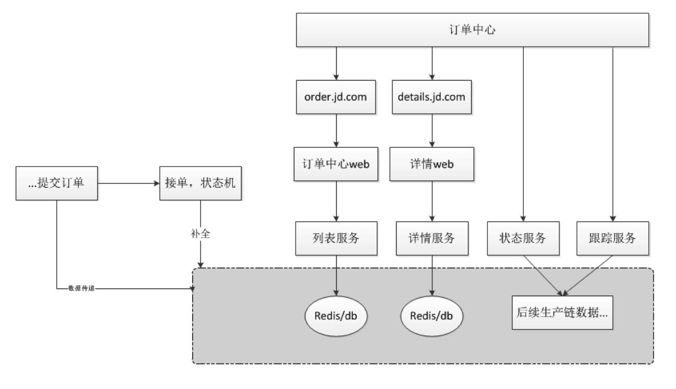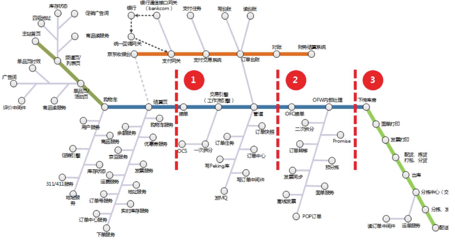 订单履约阶段,真正到后面是整个处理过程,配送黏合起来做的系统。这是京东商城的服务结构。