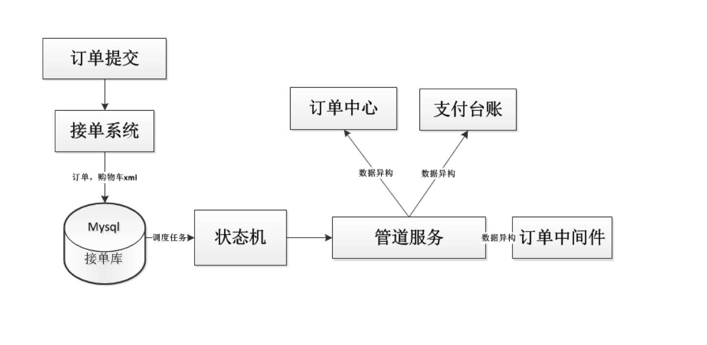 异步异构用得最多在这个系统里面。这一步接单系统的异构。接单系统在这一块的异构。我们整个接单,一次性提交订单、购物车是提交成一份数据,这样提高效率。