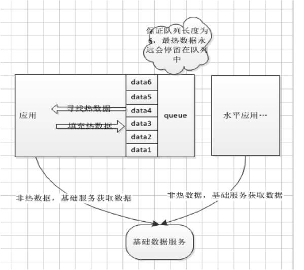 我们利用 Queue 的原理,不断往里塞 SKU,队列的长只有 50。传进来之后,这里有的位置往前移,我们很快知道在一秒钟知道,排在前面肯定是访问次数最多的,每一个阶段应用存储访问最多的数据,如果是秒杀商品,500 万的请求有十万到二十万,它肯定大部分的请求在这块就出去了,不会穿透进来,这是我们自己做的热数据缓存。