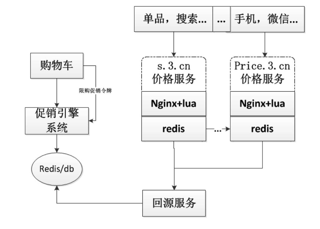 促销分流中需要把价格服务单拎出来,分出去,单品页搜索,手机微信,购物车的架构从这里出来,最实时的价格。这样产生分流,这一块有一个存储分流,还有更多其它的就没有一一列举,这只是一个示意图。