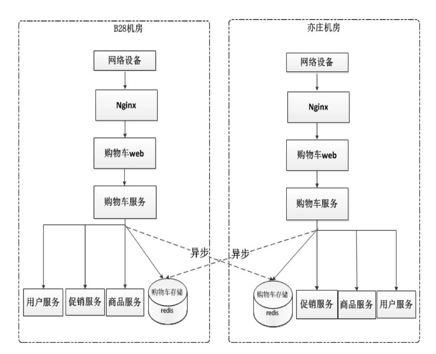 这是购物车大概的结构。这里有一个异步双写,我们会写丢这个数据,写丢没关系,我们购物车是整体的,加一个商品,写不过来,下次过来又会全覆盖。这样购物车就有一个多机房多活的可用性。