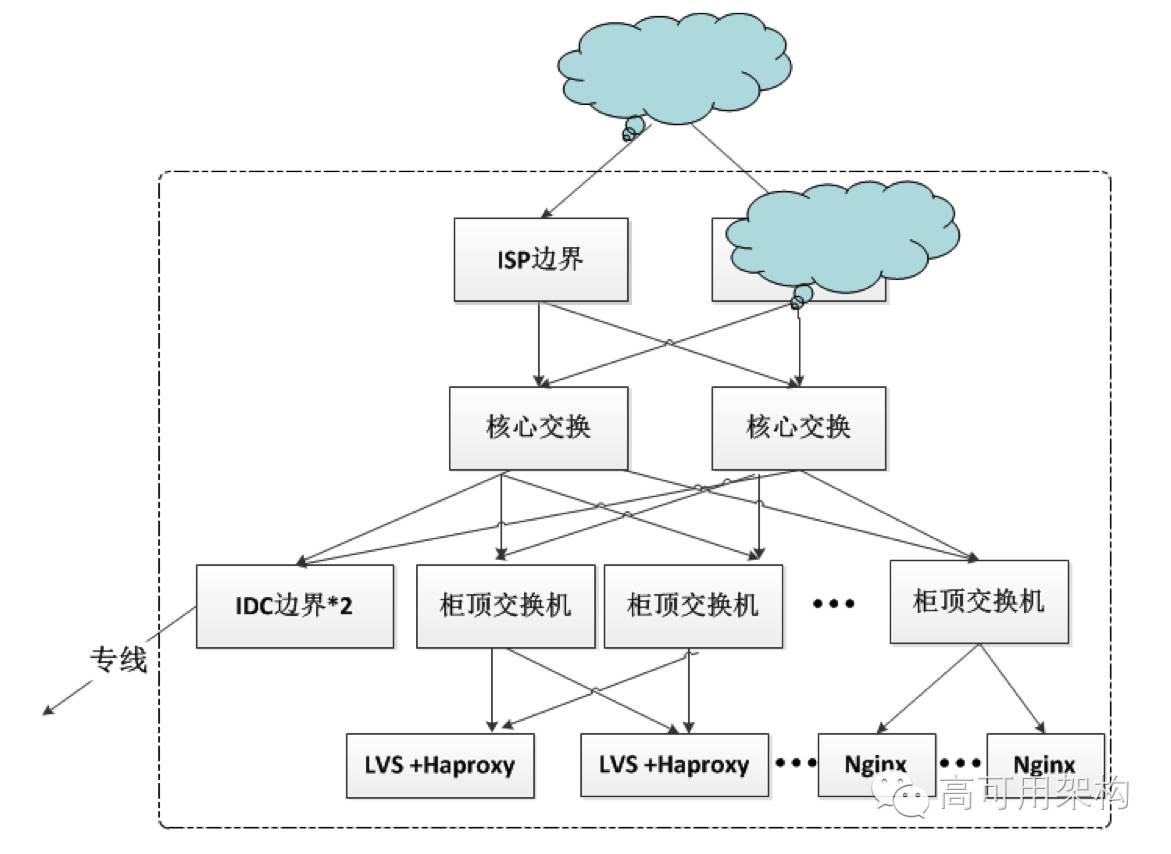 这是容灾降级,这是网络大概示意图。我们的 ISP 进入机房,核心交换机、柜顶交换机、这是交换级的容灾,网络共享容灾。