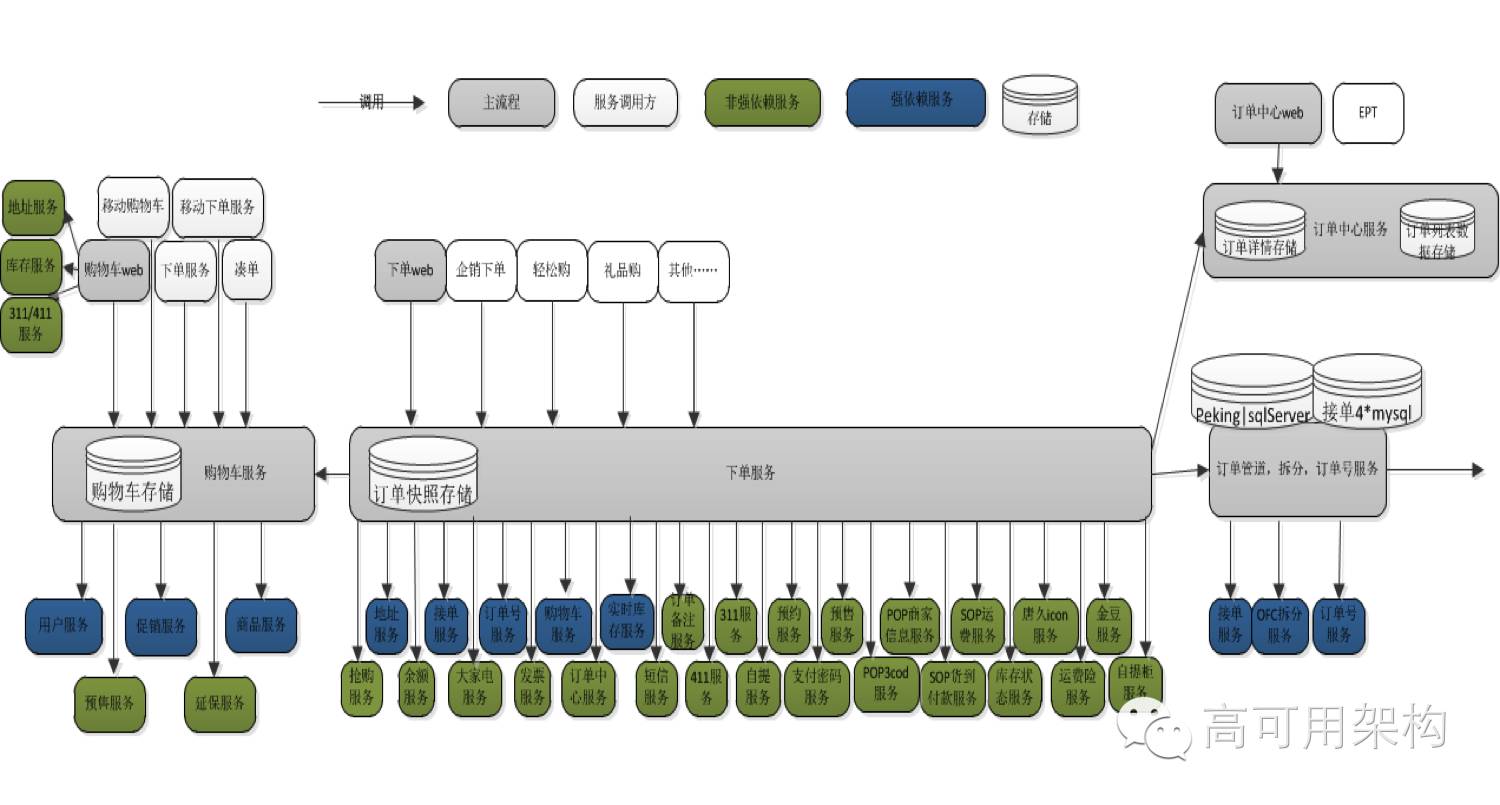 订单生成前,包括单品页,购物车,架构,促销等功能,我们每个用户进来需要访问。它的特点是大促期间访问量非常大,后面会详细介绍如何应对。