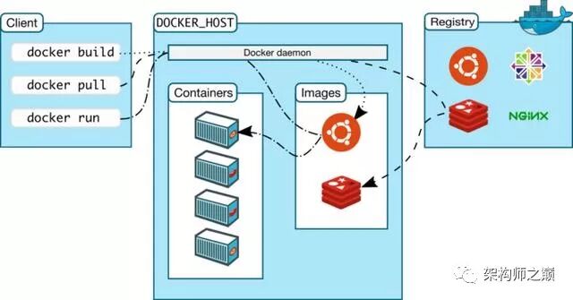 Docker更详细的架构如图所示,采用CS架构,client通过RESTFUL API发送docker命令到docker daemon进程,docker daemon进程执行镜像编译,容器启停以及分发,数据卷管理等,一个client可以与多个docker daemon通信。