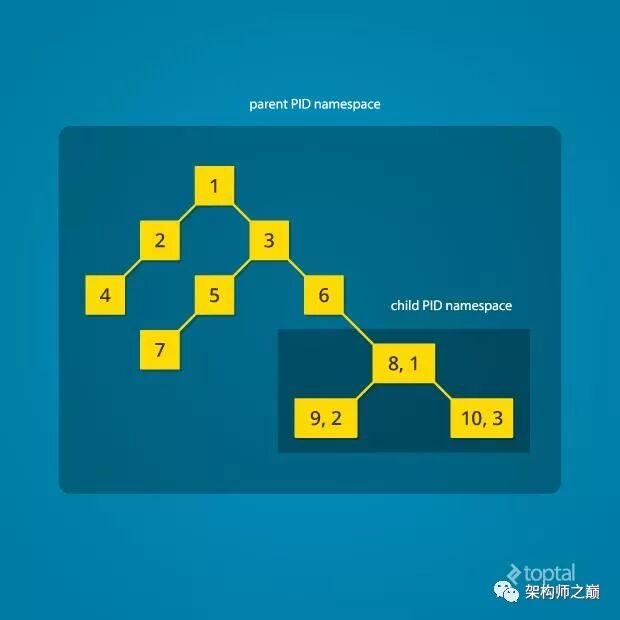 在容器中,有自己的Pid namespace,因此我们看到的只有PID为1的初始进程以及它的子进程,而宿主机的其他进程容器内是看不到的。通常来说,Linux启动后它会先启动一个PID为1的进程,这是系统进程树的根进程,根进程会接着创建子进程来初始化系统服务。PID namespace允许在新的namespace创建一棵新的进程树,它可以有自己的PID为1的进程。在PID namespace的隔离下,子进程名字空间无法知道父进程名字空间的进程,如在Docker容器中无法看到宿主机的进程,而父进程名字空间可以看到子进程名字空间的所有进程。如图所示: