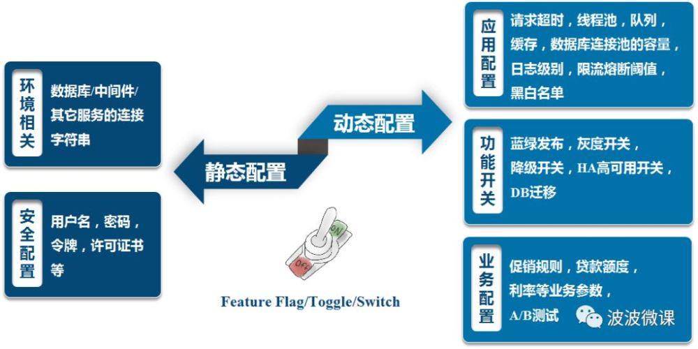 所谓动态配置,就是在程序的运行期可以根据需要动态调整的配置。动态配置让应用行为和功能的调整变得更加灵活,是持续交付和DevOps的最佳实践。具体包括: