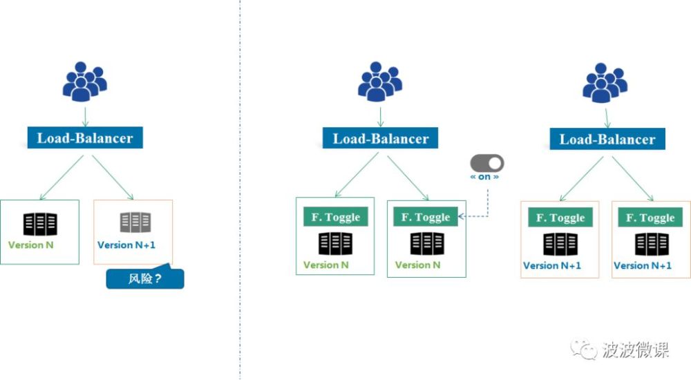 蓝绿部署也可以通过配置中心+功能开关的方式来实现,如上图右边所示。开发人员在上线新功能时先将新功能隐藏在动态开关后面,开关的值在配置中心里头配。刚上线时新功能暂不启用,走老功能逻辑,然后开发人员通过配置中心打开开关,这个时候新功能就启用了。一旦发现新功能有问题,可以随时把开关关掉切回老功能。这种做法开发人员可以全程自助实现蓝绿部署,不需要运维人员介入,反馈周期短效率高。