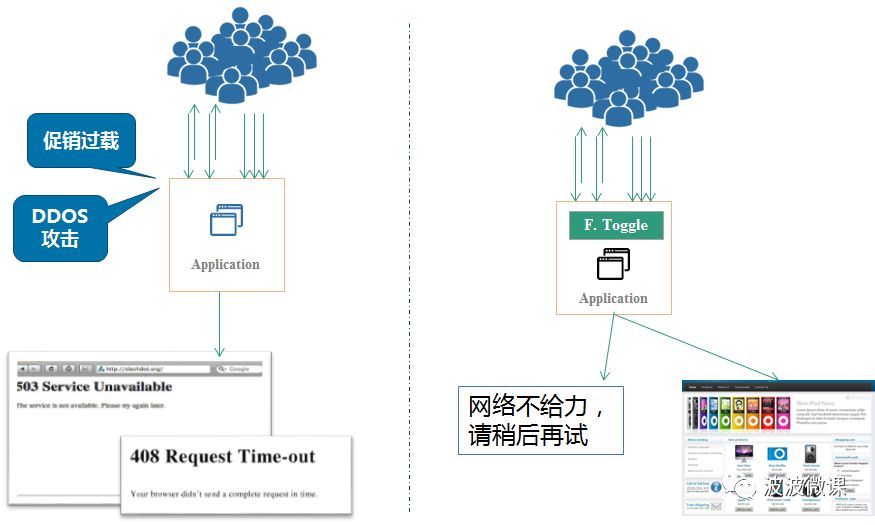 当业务团队在搞促销,或者是系统受DDOS攻击的时候,如果没有好的限流降级机制,则系统很容易被洪峰流量冲垮,这个时候所有用户无法访问,体验糟糕,如下图左边所示。