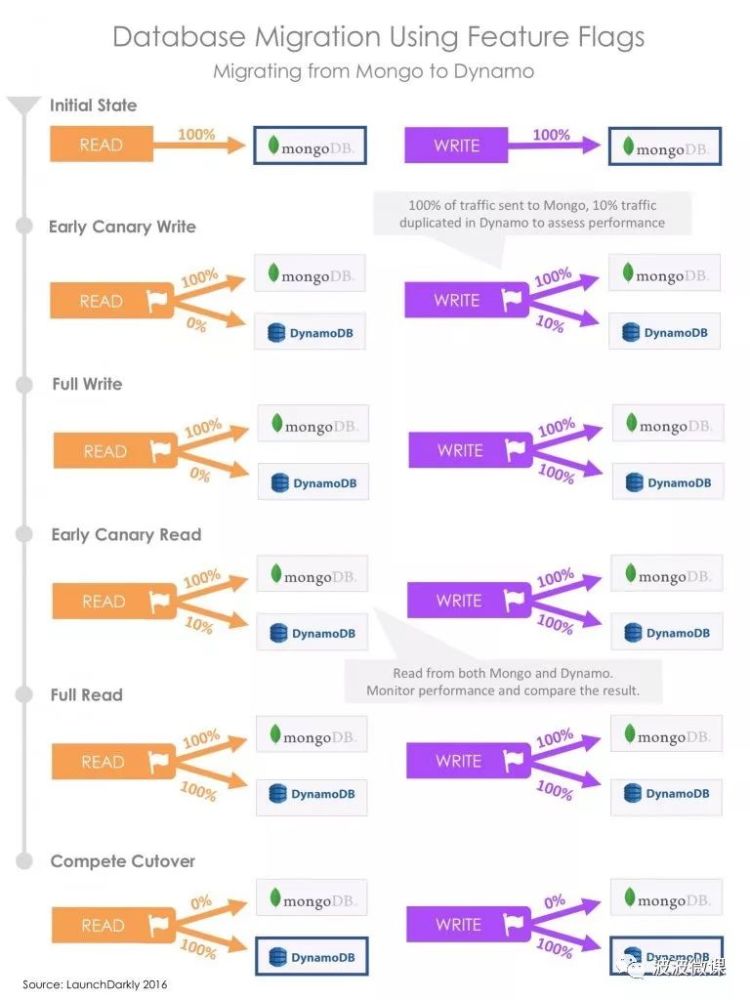 LaunchDarkly是一家提供配置既服务(Configuration as a Service)的SAAS服务公司,它在其博客上给出了一片关于使用功能开关实现数据库迁移的案例文章,该案例基于其内部一次成功的数据库迁移实践,从MongdoDB迁移到DynamoDB[参考附录9.2],下图是展示了一个简化的迁移流程: