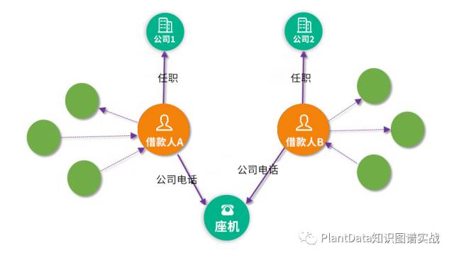 组团进行欺诈的成员会用虚假的身份去申请贷款,但部分信息是共享的。如下图可以看出贷款人A、B和C之间没有直接的关系,但通过知识图谱可以很容易的看出这三者之间都共享着某一部分信息,存在一定的组团骗贷风险。