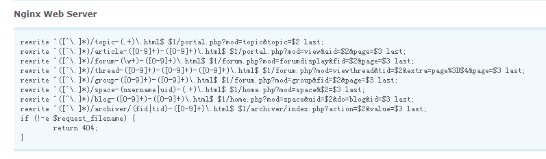 server { listen 8800; server_name 你的域名; root html/bbs; location / { index index.php index.html index.htm; rewrite ^([^\.]*)/topic-(.+)\.html$ $1/portal.php?mod=topic&topic=$2 last; rewrite ^([^\.]*)/article-([0-9]+)-([0-9]+)\.html$ $1/portal.php?mod=view&aid=$2&page=$3 last; rewrite ^([^\.]*)/forum-(\w+)-([0-9]+)\.html$ $1/forum.php?mod=forumdisplay&fid=$2&page=$3 last; rewrite ^([^\.]*)/thread-([0-9]+)-([0-9]+)-([0-9]+)\.html$ $1/forum.php?mod=viewthread&tid=$2&extra=page%3D$4&page=$3 last; rewrite ^([^\.]*)/group-([0-9]+)-([0-9]+)\.html$ $1/forum.php?mod=group&fid=$2&page=$3 last; rewrite ^([^\.]*)/space-(username|uid)-(.+)\.html$ $1/home.php?mod=space&$2=$3 last; rewrite ^([^\.]*)/blog-([0-9]+)-([0-9]+)\.html$ $1/home.php?mod=space&uid=$2&do=blog&id=$3 last; rewrite ^([^\.]*)/archiver/(fid|tid)-([0-9]+)\.html$ $1/archiver/index.php?action=$2&value=$3 last; if (!-e $request_filename) { return 404; } } location ~ .*\.(php|php5)?$ { fastcgi_pass 127.0.0.1:9000; fastcgi_index index.php; include fastcgi.conf; } access_log logs/access_bbs.log main; error_page 500 502 503 504 /50x.html; location = /50x.html { root html; } }