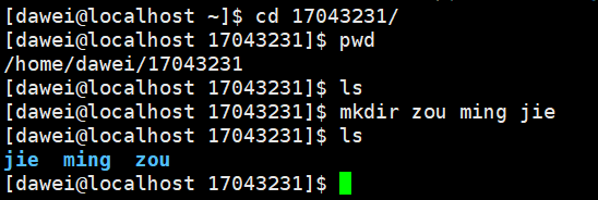 (3)进入以自己学号命名的目录,查看当前目录,然后创建以自己姓名拼音命名的目录