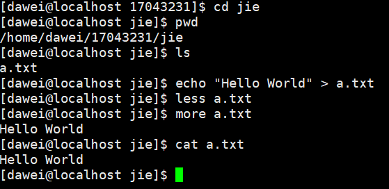 (5)进入当前目录的第一个子目录,然后显示当前目录,并列出当前目录的内容,并向文件a.txt写入一个字符串Hello World