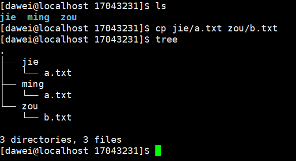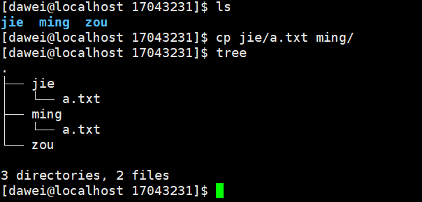(7)把当前目录的第一个子目录中文件a.txt复制到第二个子目录中,然后再次把第一个子目录中的a.txt复制到第三个子目录并命名为b.txt,最后把第一个子目录中文件a.txt重命名为c.txt。通过tree命令查看当前目录情况。