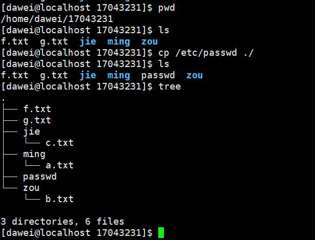 (8)把/etc目录下面的文件passwd复制到自己学号命名的文件夹下。