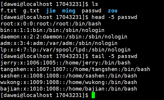 (9)用head查看passwd文件的前5行内容,用tail查看passwd文件的后5行内容