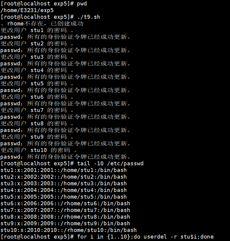 9.使用 until 语句批量创建10个用户,要求 stu1-stu5 用户的 UID 分别为 2001-2005 , stu6-stu10 用户的家目录分别在 /rhome/stu6-/rhome/stu10