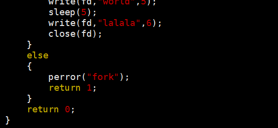 在 fork 之前以写的方式创建了一个文件 test.txt。然后 fork 出的子进程立即向文件中写入“world”,然后睡眠5秒。而父进程在 fork 后睡眠3秒后向 test.txt 写入 "hello",并关闭描述符。子进程恢复后,又向 test.txt 文件中写入 "lalala"后关闭描述符,结束。