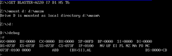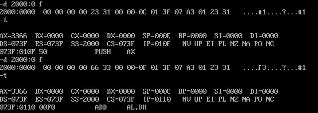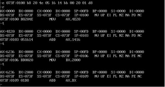 第二种方法:使用a命令写入内存,同时用使用t命令单步调试,如图所示: