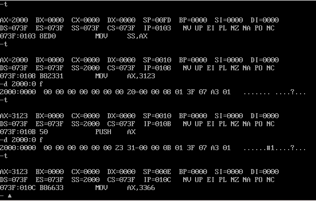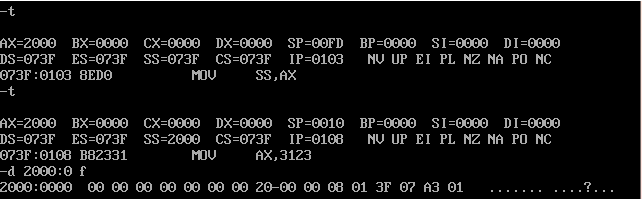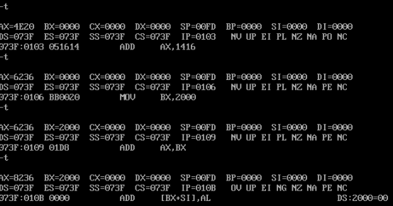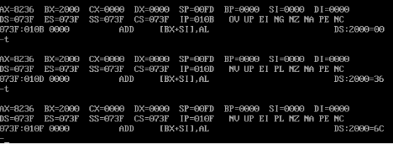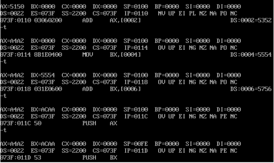 分析可知:每执行一次t命令,CS不变,IP增加3.
