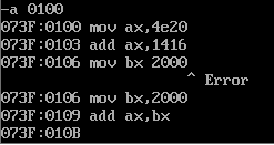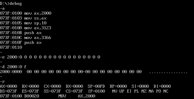 使用 a命令输入指令,使用 e 命令修改2000:0~2000:f 的值: