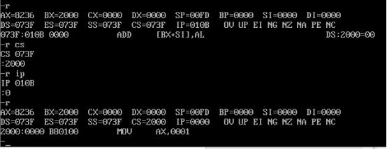 机器码 汇编指令 b8 20 4e mov ax,4E20H 05 16 14 add ax,1416H bb 00 20 mov bx,2000H 01 d8 add ax,bx 89 c3 mov bx,ax 01 d8 add ax,bx b8 1a 00 mov ax,001AH bb 26 00 mov bx,0026H 00 d8 add al,bl 00 dc add ah,bl 00 c7 add bh,al b4 00 mov ah,0 00 d8 add al,bl 04 9c add al,9CH