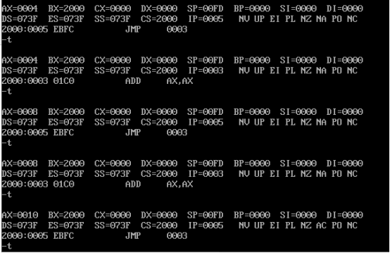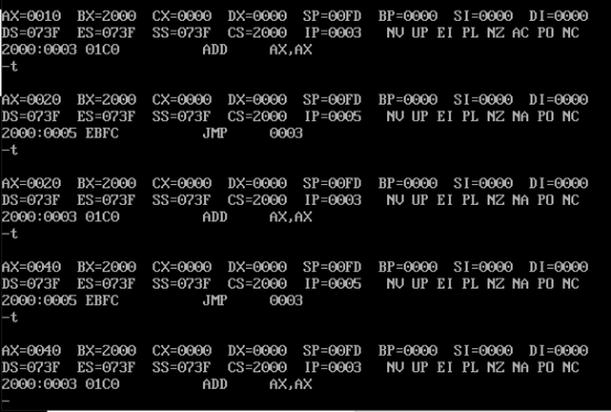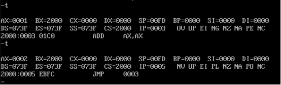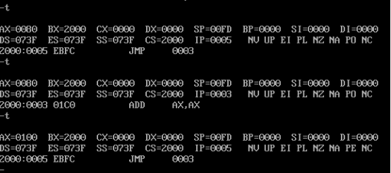JMP为立即数,表示将立即数转移到IP中,执行结果中CS:IP不断跳回2000:0003,起循环作用。