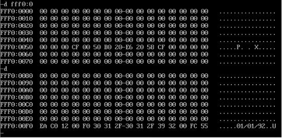 查看内存中的内容,PC机主板上的ROM中写有一个生产日期,在内存FFF00H~FFFFFH的某几个单元中,请找到这个生产日期并试图改变它。