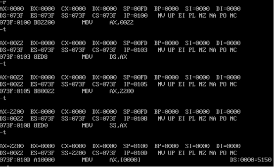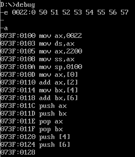 ① 在使用 a 命令输入指令调试之前,先使用 e 命令将内存单元 0022:0 ~0022:7连续 8 个字节数据修改为 50H, 51H, 52H, 53H, 54H, 55H, 56H, 57H