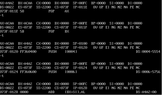 mov ax,[0] ;ax=5150H add ax,[2] ;ax=A4A2H mov bx,[4] ;bx=5554H add bx,[6] ;bx=ACAAH push ax ;sp=00FEH ; 修改的内存单元的地址是2200:00FE内容为A4A2H push bx ;sp=00FCH ; 修改的内存单元的地址是2200:00FC内容为ACAAH pop ax ;sp=PPFEH ; ax=ACAAH pop bx ;sp=00FCH ; bx=A4A2H push [4] ;sp=00FEH ; 修改的内存单元的地址是2200:00FE内容为5554H push [6] ;sp=00FCH ; 修改的内存单元的地址是2200:00FC内容为5756H