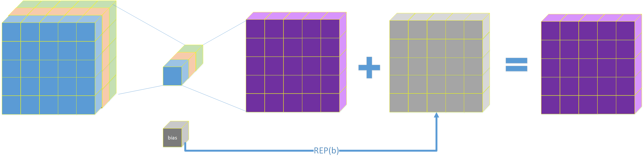 通过REP操作我们把b扩展成一个和输出的h和w的一样矩阵,之后这个矩阵再和卷积核进行卷积,还拿上面例子来演示