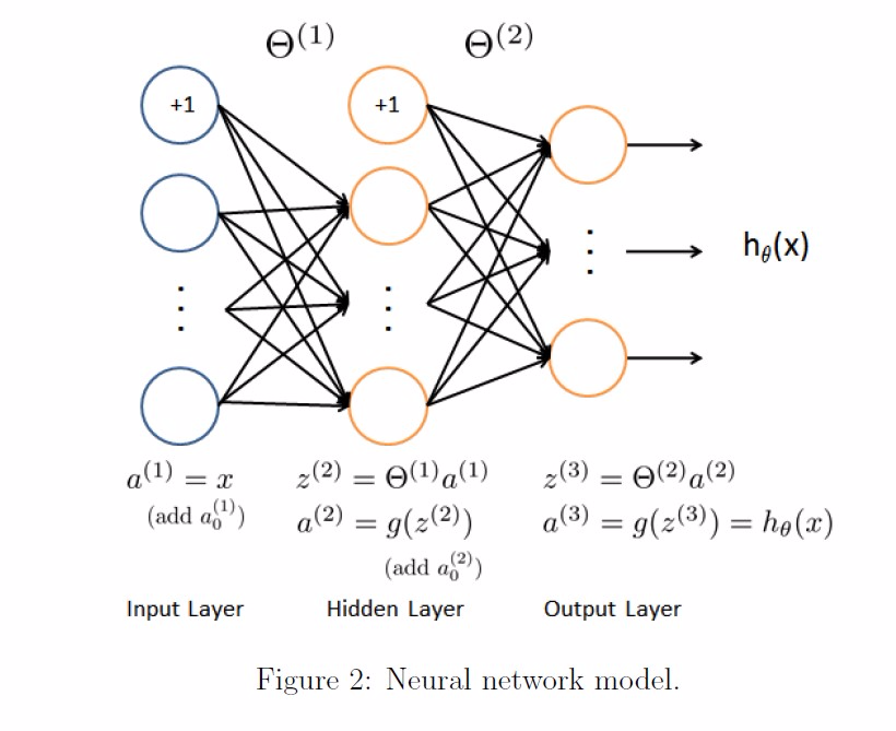 怎么样处理偏置项,偏置是放在神经元里面还是放在神经元外面,其实作业上已经给出了说明,就是“Model representation”这一节,在输出层之外的每一层都多加了一个输出始终为“1”的神经元。