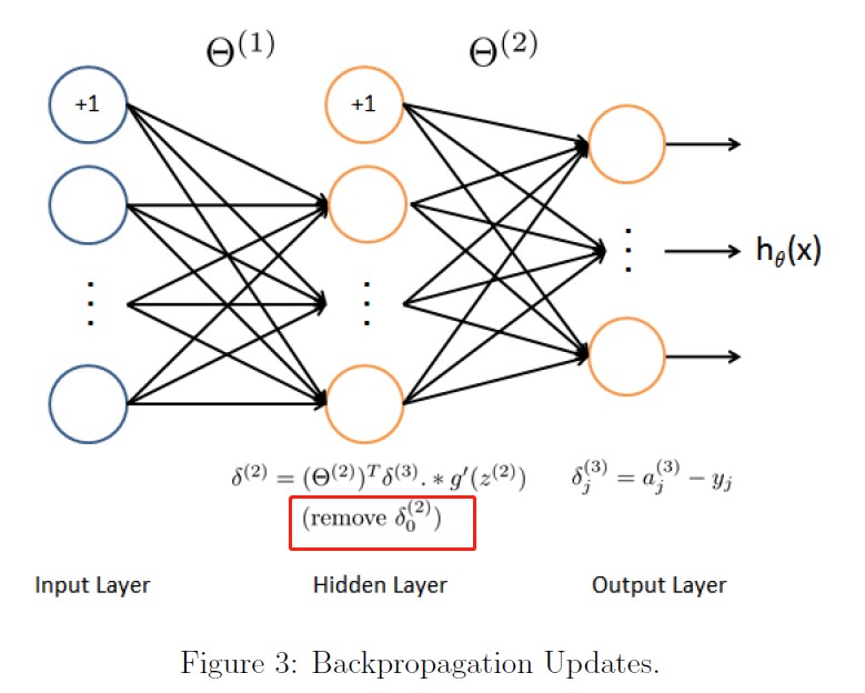 从这里可以看到在BP的过程中,再求的时候出现了计算公式里的两个构成因子的维度出现了不一致的情况,如果说在FP过程中,再求的时候还可以利用“z3 = Theta2 * [1;a2]”的方法绕过到底要不要更改的问题,但是在BP的过程里这个问题实在是绕不过去了。其实仔细观察这两个因子,这部分能改吗?好像也没有改的空间,因为你无论怎么改都说不过去。