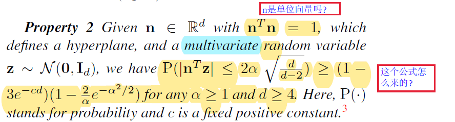 性质2 性质二也懒得翻译的latex打到吐血。它其实说了这么一个事情,空间上的点到某个平面的距离,在一个比较大的概率上都在某个区域内,如果这个空间的点服从某种分布。