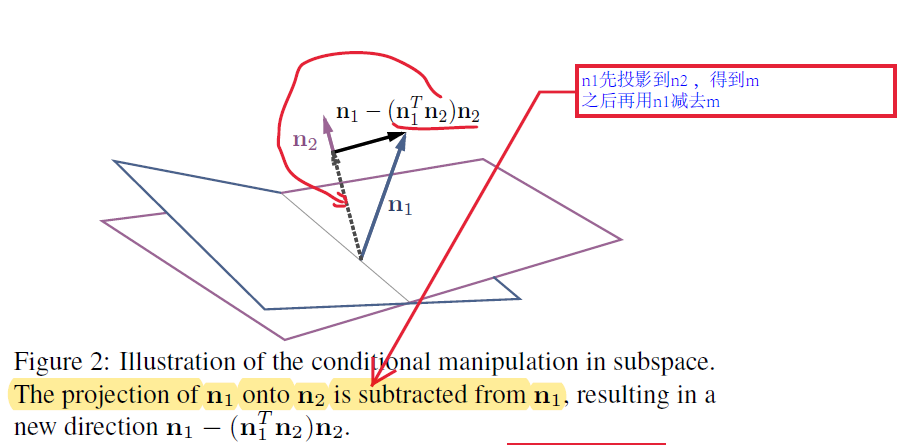 Conditional Manipulation 当有多个属性时,编辑一个属性可能会影响另一个属性,因为一些语义可以相互耦合。为了实现更精确的控制,我们提出了条件操作,手动强制式(5)中的N^TN为对角阵。特别地,我们使用投影来正交不同的向量。如图2所示,给定两个法向量n1和n2的超平面,我们得到了一个投影方向n1−(n1^Tn2)n2,使得沿着这个新方向移动样本可以改变“属性1”而不影响“属性2”。我们称这种操作为条件操作。如果有多个属性需要条件化,我们只需减去原始方向到由所有条件化方向构成的平面上的投影。