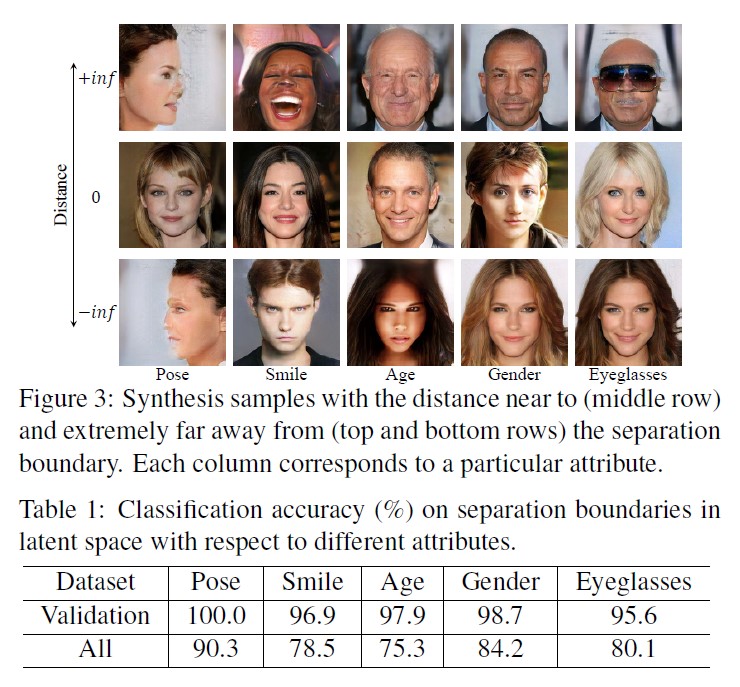 我们针对姿势、微笑、年龄、性别、眼镜训练5个独立线性支持向量机,然后在验证集(属性得分置信度高的6K样本)和整个集合(480K随机样本)上对它们进行评估。表1显示了结果。我们发现所有的线性边界在验证集上都达到了95%以上的精度,在整个验证集上达到了75%以上的精度,这表明对于一个二元属性,潜在空间中存在一个线性超平面,可以很好地将数据分为两组。我们还将图3中的一些样本按照到决策边界的距离进行排序。请注意,这些极端情况(图3中的第一行和最后一行)不太可能直接采样,而是通过向法线方向“无限”移动潜在代码来构建。从图3可以看出,正样本和负样本在对应的属性上是可区分的。
