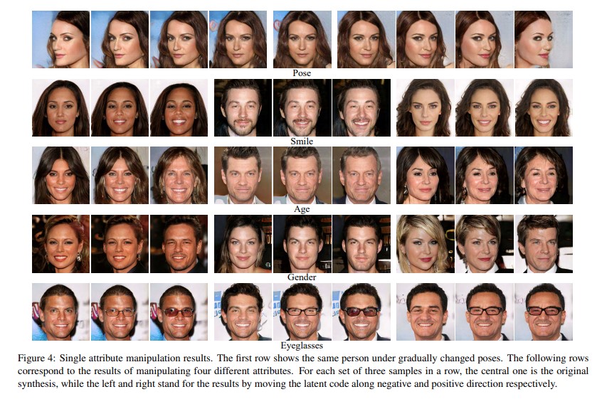 图4绘制了5个不同属性的操作结果。这表明我们的操作方法在正向和负向的所有属性上都表现良好。特别是在位姿属性上,我们观察到即使通过求解双分类问题来搜索边界,移动潜码也会产生连续的变化。此外,尽管在训练集中缺乏足够的极端姿势的数据,GAN能够想象侧脸应该是什么样子。同样的情况也发生在眼镜属性上。尽管训练集中的数据不足,我们仍然可以手动创建许多戴眼镜的面孔。这两个观察结果提供了强有力的证据,证明GAN不是随机产生图像,而是从潜在空间学习一些可解释的语义。