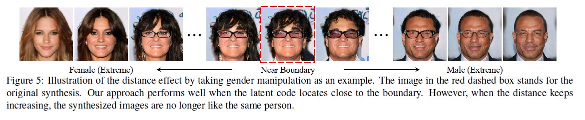 Distance Effect of Semantic Subspace.在对潜码进行操作时,我们观察到一个有趣的距离效应,如果离边界太远,样本的外观会发生严重的变化,最终趋向于成为图3所示的极端情况。图5以性别编辑为例说明了这一现象。近边界操作效果很好。然而,当样本超过某个区域时,编辑的结果就不再像原来的脸了。但这种效应并不影响我们对潜空间解纠缠语义的理解。这是因为这种极端样本不太可能直接从标准正态分布中提取,这一点在第2.1节的性质2中已经指出。相反,它们是通过沿着特定的方向不断移动正常采样的潜在代码来手动构造的。这样可以更好地解释gan的潜在语义。