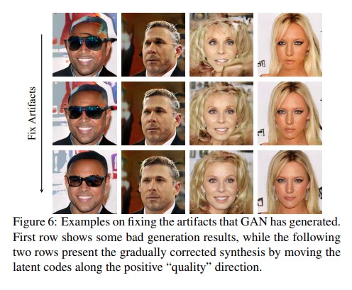 我们进一步应用我们的方法来修复合成输出中有时出现的工件。我们手动标记4K不良合成,然后训练线性支持向量机找到分离超平面,和其他属性一样。我们惊奇地发现GAN也在潜伏空间中编码这些信息。基于这一发现,我们能够修正GAN在生成过程中所犯的一些错误,如图6所示。