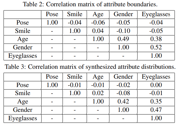 表2和表3报告了结果。我们可以看出,属性在这两个指标下的行为相似,这表明我们的InterFaceGAN能够准确地识别隐藏在潜在空间中的语义。我们还发现姿势和微笑几乎与其他属性正交。然而,性别、年龄和眼镜是高度相关的。这一观察结果在一定程度上反映了训练数据集(即CelebA-HQ[21])中的属性相关性,其中男性老年人更倾向于佩戴眼镜。GAN在学习产生真实观察时也捕捉到了这一特征。