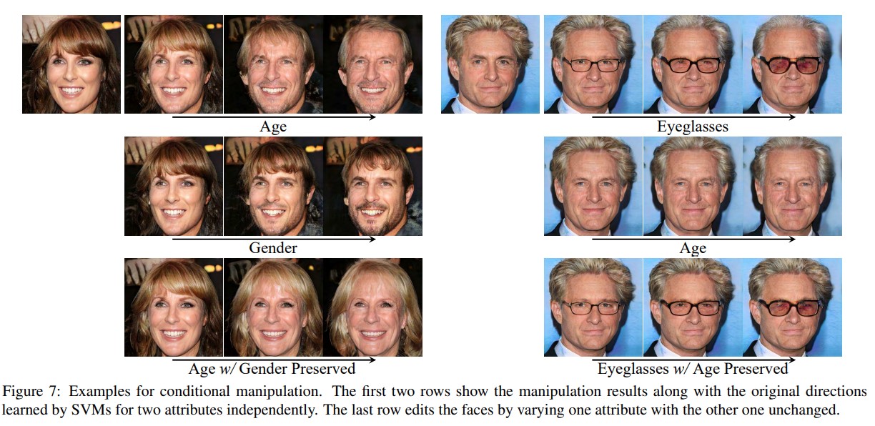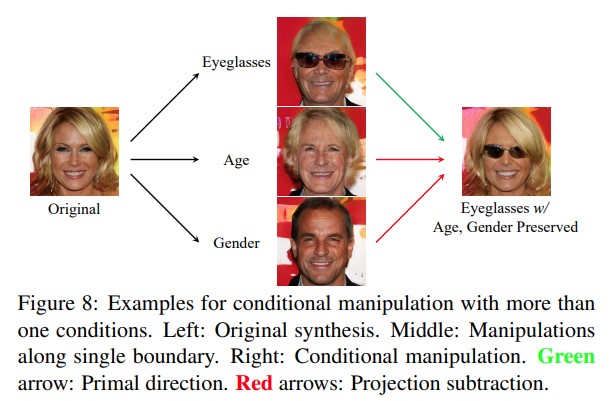 Conditional Manipulation 为了将不同的语义去关联到独立的面部属性编辑中,我们在第2.2节中提出了条件操作。图7显示了用一个属性操作另一个属性作为条件的一些结果。以图7中左侧样本为例,随着年龄的增长(第一行),结果趋于男性化。我们通过从年龄方向减去它在性别方向(第二行)上的投影来解决这个问题,从而得到一个新的方向。这样,当样本沿着投影方向(第三行)移动时,我们可以确保性别成分几乎不受影响。图8显示了具有多个约束的条件操作,其中我们通过有条件地保留年龄和性别添加眼镜。起初,戴眼镜与改变年龄和性别纠缠在一起。但通过投影操作,我们成功地在不影响年龄和性别的情况下添加了眼镜。这两个实验表明,我们提出的条件控制方法有助于实现独立和精确的属性控制。