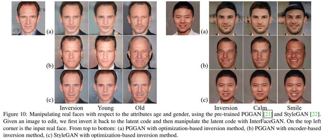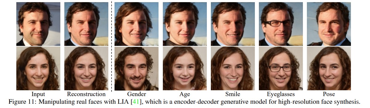 Semantic Face Editing with GANs. 语义人脸编辑旨在操纵给定图像的人脸属性。与可以任意生成图像的无条件GANs相比,语义编辑希望模型只改变目标属性,但保持输入人脸的其他信息。为了实现这一目标,目前的方法需要精心设计的损失函数[29,10,35],引入额外的属性标签或特征[25,39,3,37,34],或特殊的架构[11,33]来训练新模型。然而,这些模型的合成分辨率和质量远远落后于原生gan,如PGGAN[21]和StyleGAN[22]。与以往基于学习的方法不同,本文探索了固定GAN模型潜空间内的可解释语义,通过改变潜代码将无约束的GAN转变为可控的GAN。