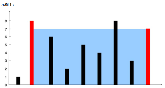 解释:图中垂直线代表输入数组 [1,8,6,2,5,4,8,3,7]。在此情况下,容器能够容纳水(表示为蓝色部分)的最大值为 49。