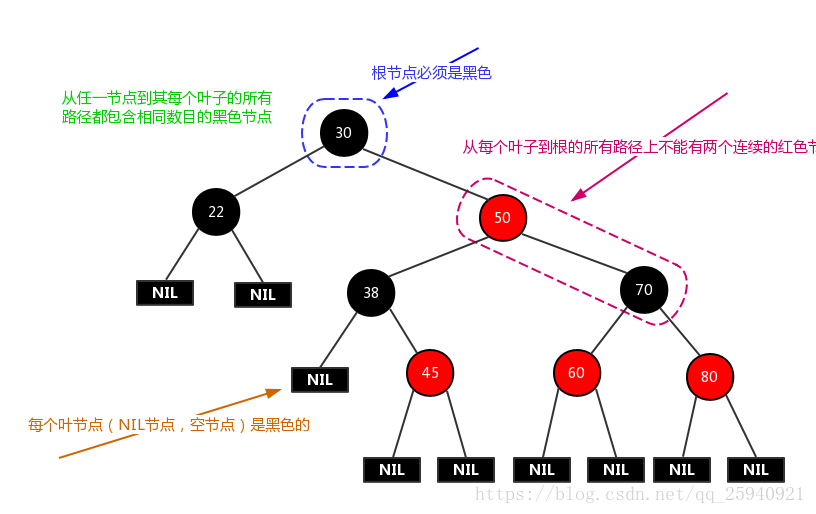 (3)每个叶节点(NIL节点,空节点)是黑色的;