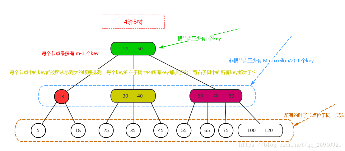 (3)非根节点至少有 Math.ceil(m/2)-1 个key;