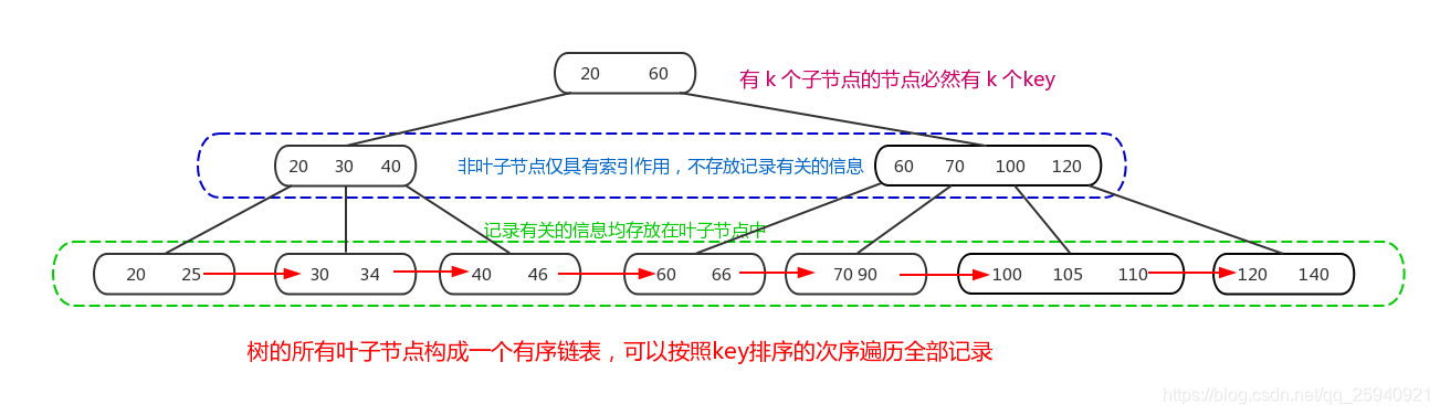 (2)非叶子节点仅具有索引作用,跟记录有关的信息均存放在叶子节点中。